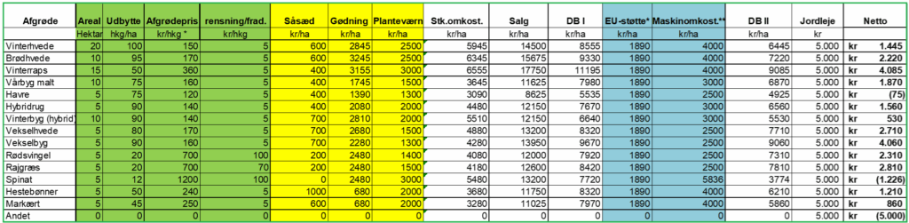 Som vanligt har vi lavet en oversigt over økonomien ved de forskellige afgrøder. Tal er taknemmelige. Tal kan diskuteres. Ofte snyder folk sig selv, især når der skal gives bud på en forpagtning eller købes tillægsjord.