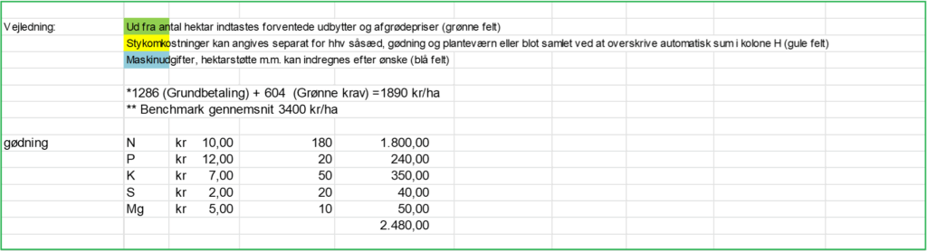 Her kan du selv lege med tallene. Gødningen er dyrere til den kommende sæson (ind til videre). Samtidig er mange salgspriser faldet i forhold til sidste år (ind til videre).