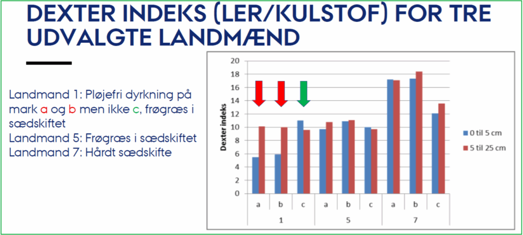 Landmand 1 dyrker sin jord pløjefrit i mark a og b, men ikke mark c, som han lige har erhvervet. Læg mærke til at humusindholdet er væsentligt højere i 0-5 cm, hvorimod det er tilsvarende landmand 5 fra 5-25 cm dybde. Landmand 5 holder sit Dexter indeks lige omkring de kritiske 10 ved at have frøgræs inde i sædskifter, som traditionelt har et stort rodnet.