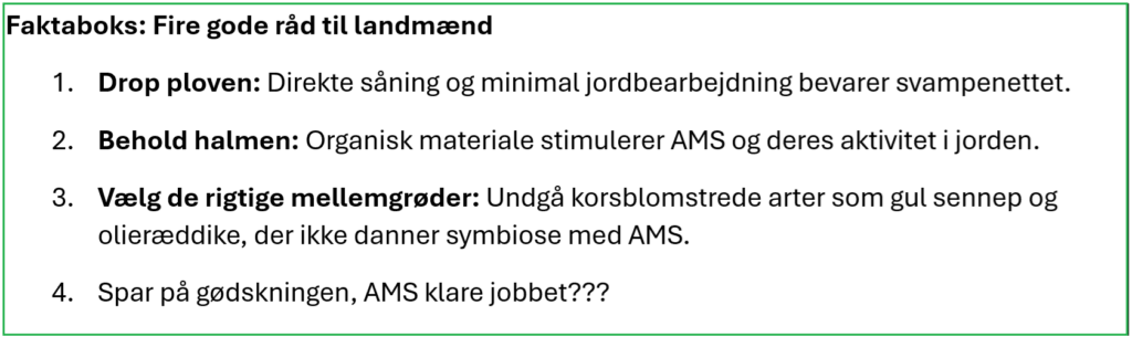 AMS er altså ikke bare en kuriøs del af jordens mikroliv. De er ifølge Sabine Ravnskov en forudsætning for sund plantevækst, god jordstruktur og et mere bæredygtigt landbrug. Og måske vigtigst: De arbejder gratis. Vi skal blot sørge for ikke at ødelægge deres levesteder.