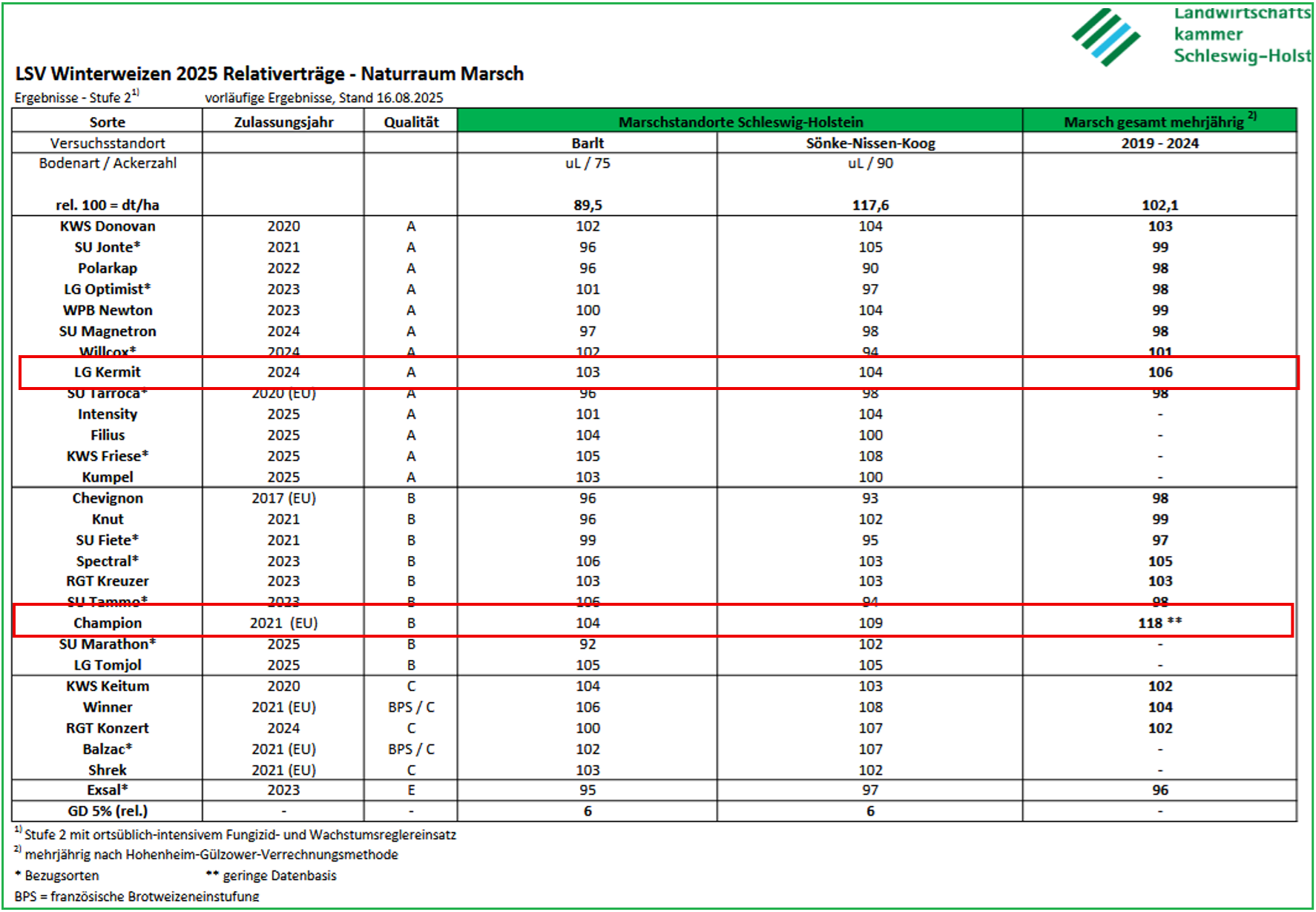 Tyskerne er også lidt sene til at få lagt udbytteforsøg på hjemmesiden, herunder fra Slesvig-Holsten. Der er ikke så mange sorter, vi kender. Den gamle Chevignon, som i Danmark er kendt som en tidlig sort, bliver stadig dyrket i Tyskland, selv om det kniber med, at den kan følge med. Som i landene omkring os bliver der dyrket meget brødhvede i Tyskland. Sorterne bliver delt op i A-hvede, B-hvede og C-hvede: