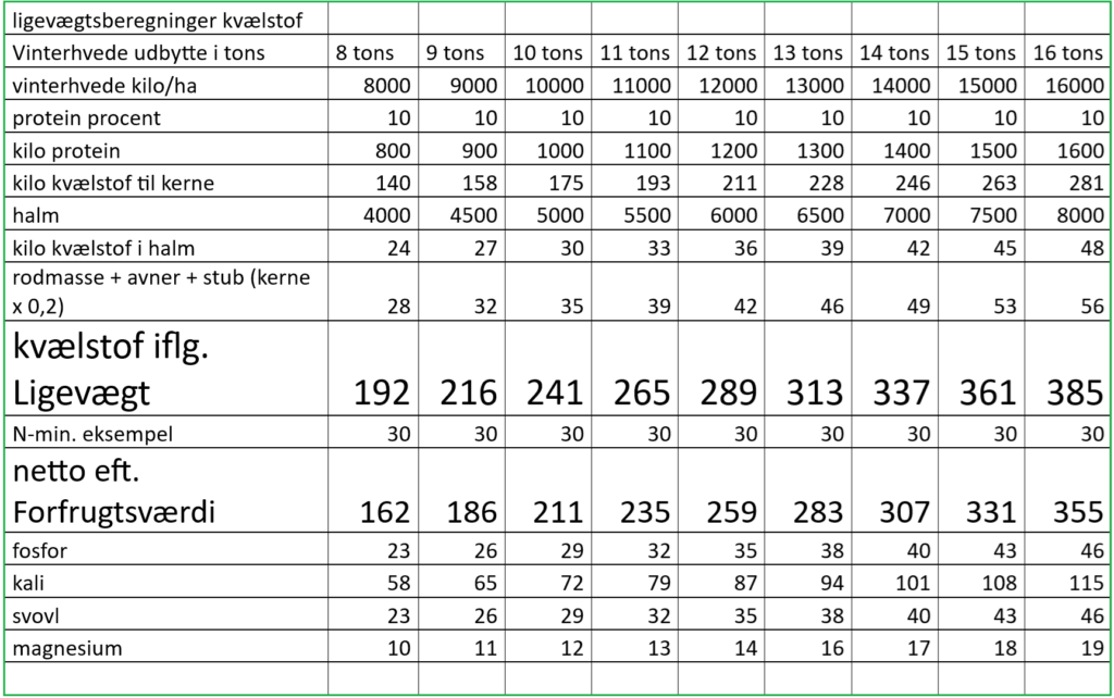 Ligevægtsberegningsskema, der viser behov for gødning ved et givent udbytte og proteinindhold.